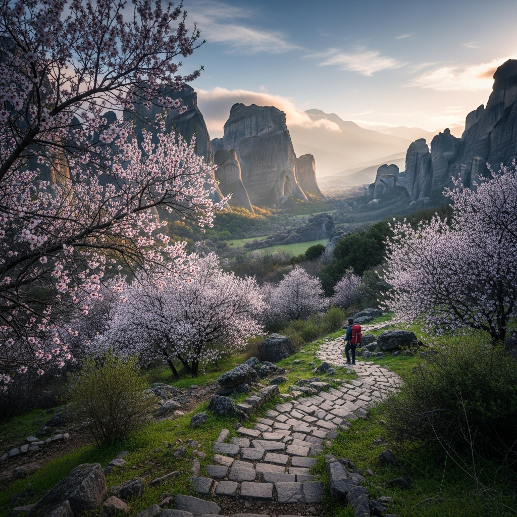 March in Greece is a spectacle of nature and tranquility. The air is crisp, ideal for exploration, and the landscape bursts into life with the delicate blossoms of almond trees, mirroring the beauty of Japan’s cherry blossom season but with an exclusive, uncrowded feel. This is the prime time for immersive adventures: